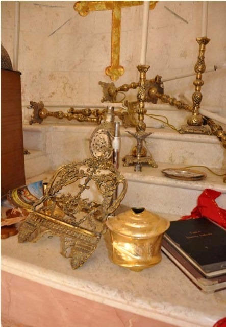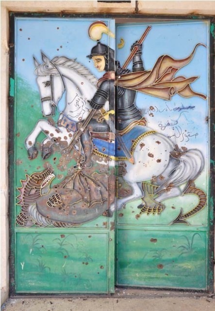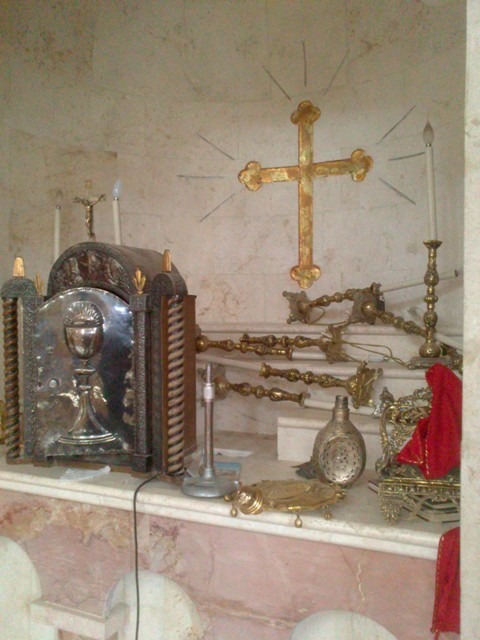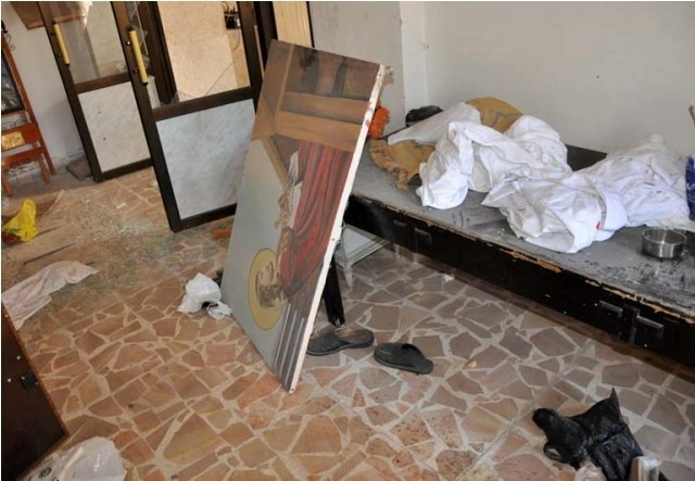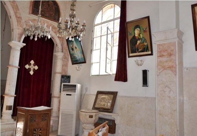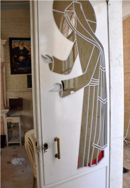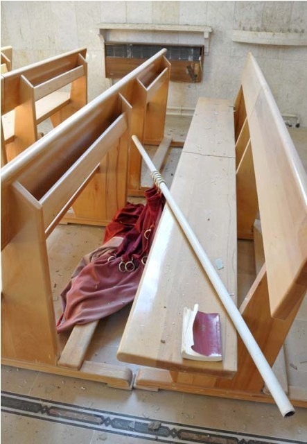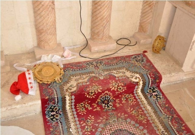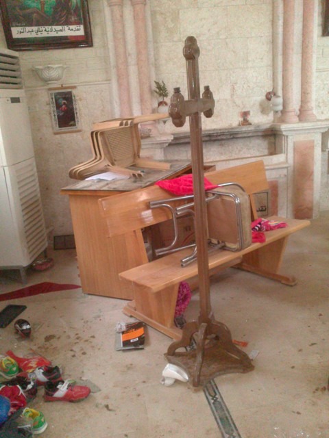 Photos from the Syrian Catholic Church of St. Mary Magdalene and the Armenian Church of St. Hagob (Jacoub) tell a related story, though it seems that the group of rebels inside these two churches was not from Suqoor Al-Sunna, but a different group. Here we see less damage, except the breaking of the statue of St. Anthony.