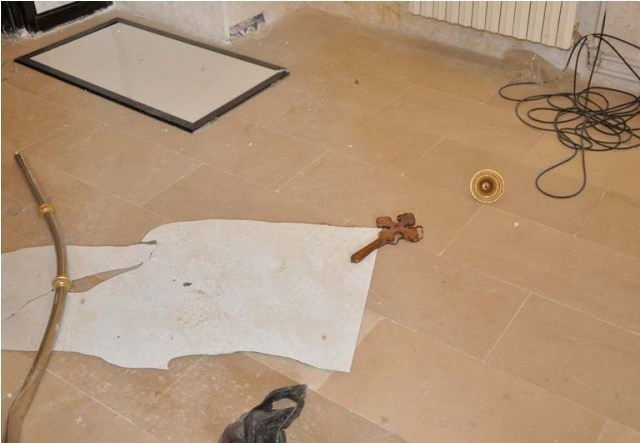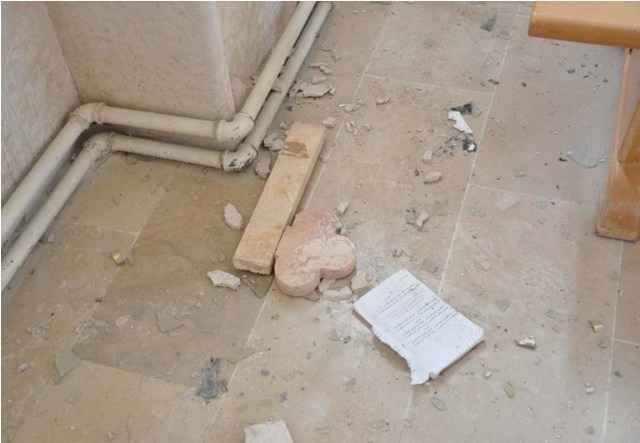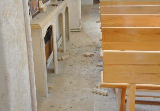 In photo number 4, you can see a big bomb. This was first discovered one day before the Street of Churches was taken over by the Kurdish forces. Some courageous people from our church, who had returned to check on their properties in town, came to see the church. While they were searching the church, they saw a blanket covering something. They were curious to see what was beneath the blanket. They were astonished to see a very big bomb. Thankfully, one of them had knowledge of how to stop the bomb from functioning. He cut off the wire and released the three detonators of the bomb; he then put the blanket back on the bomb so that the rebels would not know what he had done. The rebels had planned to bomb the church building, the old school building, the church hall, and the parish house. We believe their intention was to do this once they saw the Kurdish armed forces go inside the buildings. We give thanks to our God that our church people were there at the right time to stop the bomb.