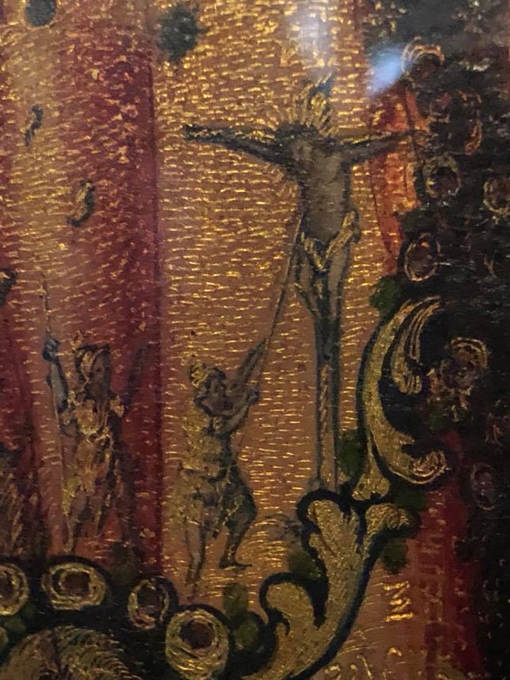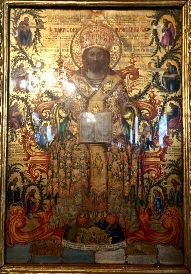 “Has never seen anything quite like the icons of the Iconostasis of the Cathedral of St John the Evangelist in Nicosia. They were completed around the year 1800. The following photos are of Christ. There wasn’t enough time to take similar photos of the Theotokos, John the Baptist and John the Evangelist, but they are similar in their strangeness. They are all covered with text, and loaded with miniatures that only reveal themselves under great scrutiny. As they are protected by reflective glass, it’s difficult to capture them with complete clarity. The miniatures of scenes from the life of Christ are “embroidered” in his vestments, and are smaller than a man’s thumbnail.” – Metropolitan Savas Zembillas of Pittsburgh.