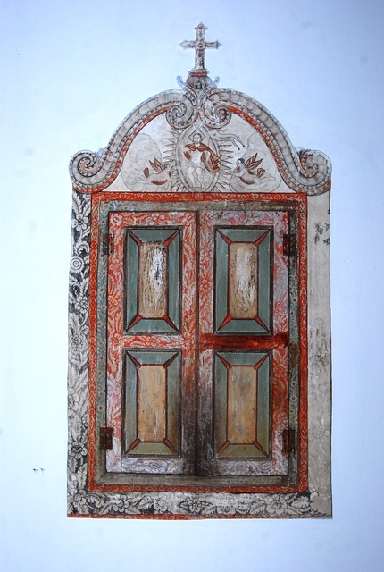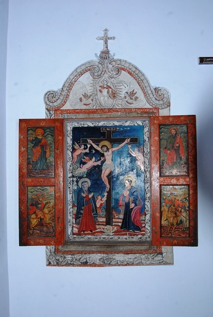 “The main part is for sure a Byzantine icon of the style we call “laiki tehni” or folk art but still Byzantine. The only difference is the INRI which is the Latin letters and usually in our icons only the Greek letters are shown INBI or the letters for King of Glory. The top two icons are evangelists. On the bottom it seems there is the conquest of your lands by the latin invaders (Portugese). ”